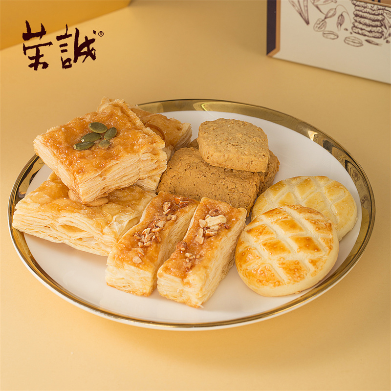100g鹽焗巴旦木果仁x1,100g開心果x1,18g燕麥方塊脆x15,10g松塔x8,20g腰果千層酥x2,20g椰絲千層酥x2,20g南瓜籽千層酥x2,25g芒果味軟心格子西餅x3,25g生椰拿鐵軟心格子西餅x2,25g榴蓮味軟心格子西餅x2,25g海鹽檸檬味軟心格子西餅x3