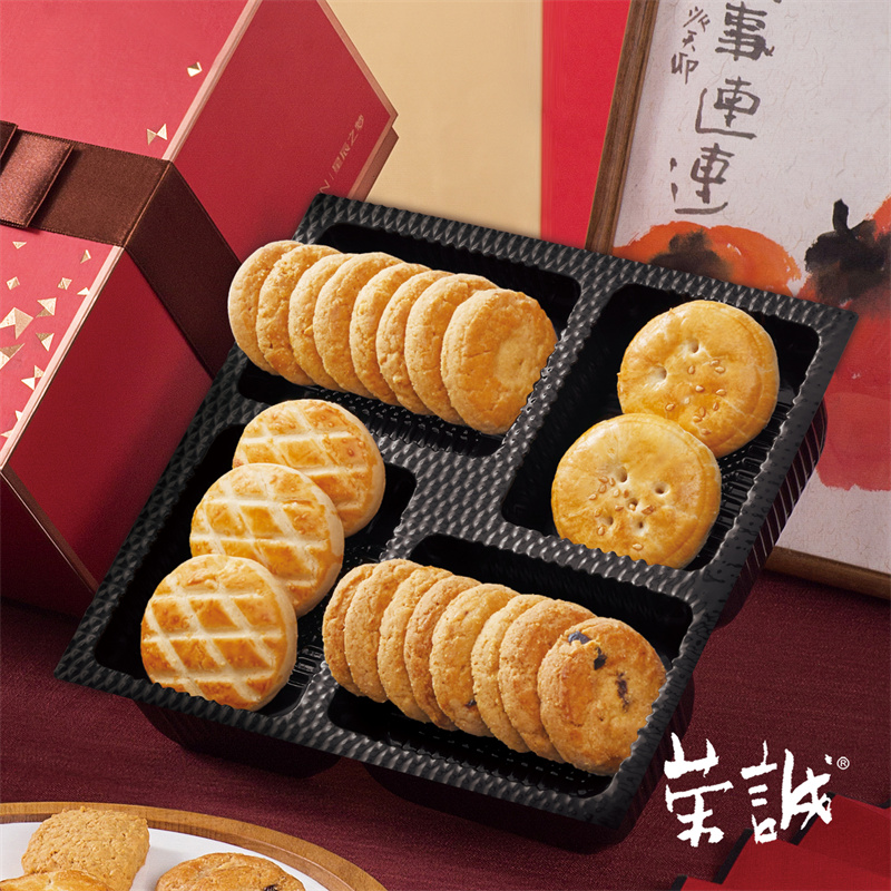 35g絲絲濃香椰蓉餅x2,25g芒果味軟心格子西餅x3,30g香妃鳳梨酥x4,18g燕麥方塊脆x6,10g香焙杏仁酥x8,10g香焙蔓越莓酥x8,8g巧克力味曲奇x8,8g果仁曲奇x8