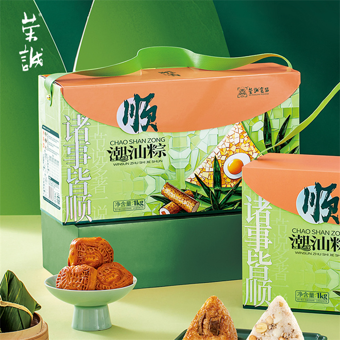 100g潮汕地道鹵水肉粽x2,100g潮汕秘制菜脯鮮鴨肉粽x2,100g潮汕蜜制桂香糯藕粽x2,100g潮汕特色甜肴五果粽x2,35g腐乳餅x4,30g滋芯綠豆糕(海鹽檸檬味)x2
